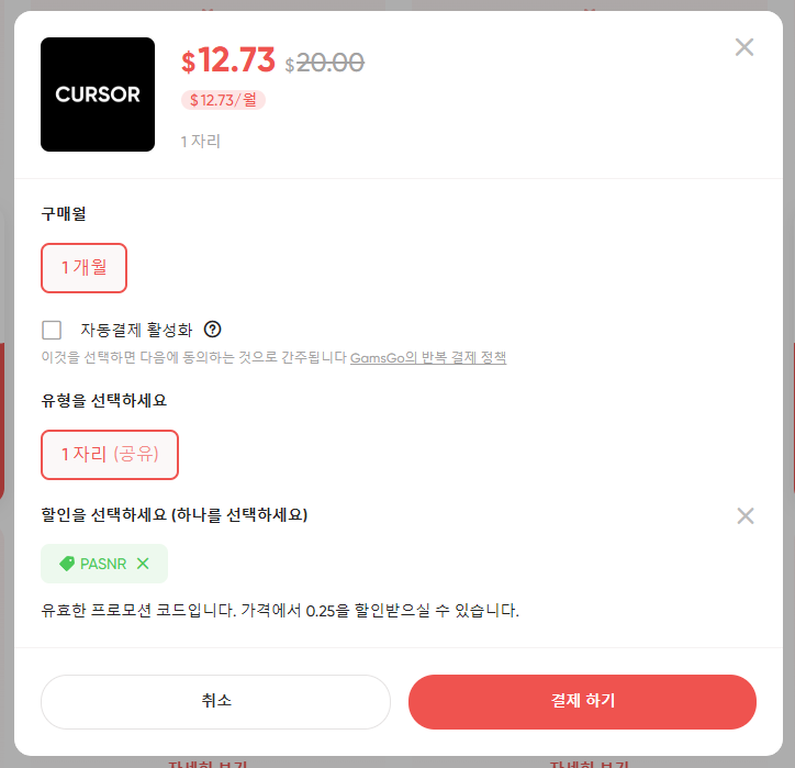 PASNR 프로모션 코드 사용시 0.25달러 할인 - 즉시 Cursor 계정 정보 수령 및 서비스 이용 시작