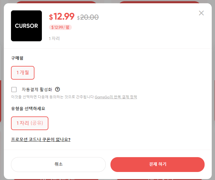 개발 생산성을 높이는 데 필수적인 도구인 Cursor를 더 이상 비싼 가격으로 구독할 필요 없습니다. 겜스고(GamsGo)의 계정 공유 서비스를 통해 월 12.99달러라는 합리적인 가격으로 Cursor의 모든 프리미엄 기능을 제한 없이 이용하실 수 있습니다.